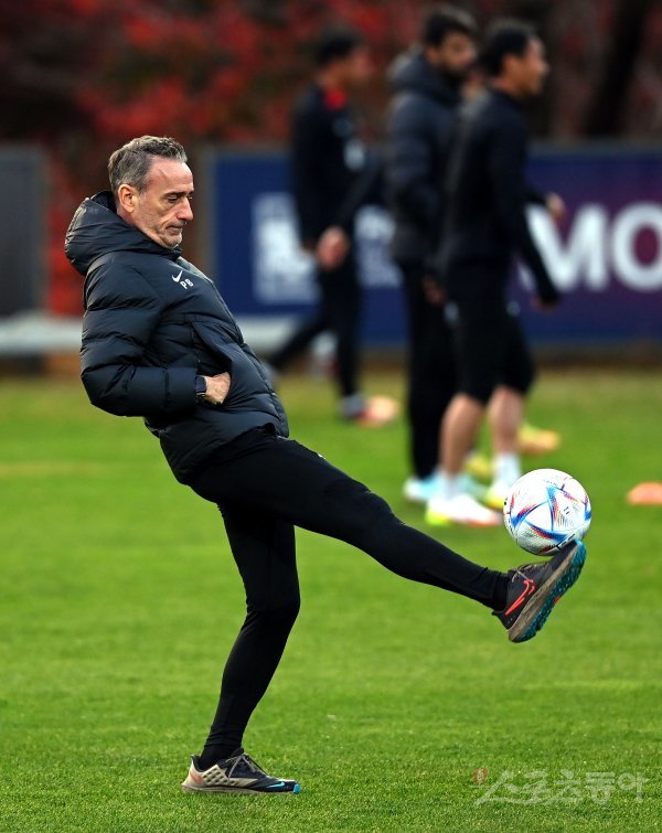 2022 카타르 월드컵을 대비해 아이슬란드와 마지막 국내 평가전을 앞두고 한국축구대표팀이 3일 경기도 파주 축구국가대표팀트레이닝센터(NFC)에서 훈련을 가졌다. 축구대표팀 벤투 감독이 볼 트래핑을 펼치고 있다.