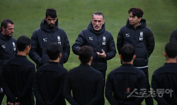 2022 카타르 월드컵을 대비해 아이슬란드와 마지막 국내 평가전을 앞두고 한국축구대표팀이 3일 경기도 파주 축구국가대표팀트레이닝센터(NFC)에서 훈련을 가졌다. 축구대표팀 벤투 감독이 코치, 선수들과 이야기를 나누고 있다.