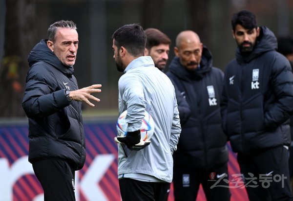 2022 카타르 월드컵을 대비해 아이슬란드와 마지막 국내 평가전을 앞두고 한국축구대표팀이 3일 경기도 파주 축구국가대표팀트레이닝센터(NFC)에서 훈련을 가졌다. 축구대표팀 벤투 감독이 코치들과 이야기를 나누고 있다.