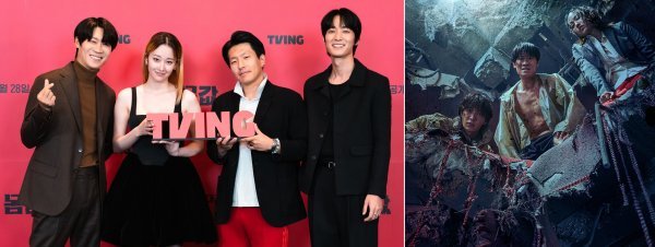 장률(왼쪽부터)이 공개 전 진행한 온라인 제작발표회에서 참석해 포즈를 취하고 있다. 오른쪽 사진은 극중 한 장면. 사진제공|티빙