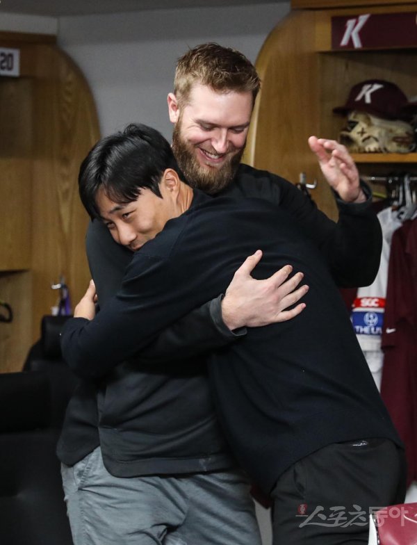 4일 서울 고척스카이돔에서 열린 ‘2022 신한은행 SOL KBO리그’ 한국시리즈 3차전 키움 히어로즈와 SSG 랜더스의 경기에 앞서 샌디에이고 김하성이 방문해 요키시와 인사하고 있다.
