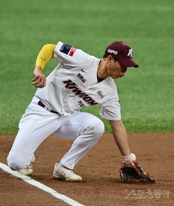 4일 서울 고척스카이돔에서 열린 ‘2022 신한은행 SOL KBO리그’ 한국시리즈 3차전 키움 히어로즈와 SSG 랜더스의 경기에서 3회초 2사 1루 SSG의 안타 때 키움 송성문이 베이스를 맞고 바뀐 타구에 볼을 놓치고 있다.