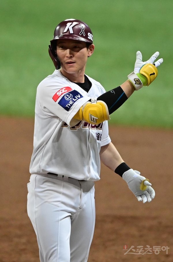 4일 서울 고척스카이돔에서 열린 ‘2022 신한은행 SOL KBO리그’ 한국시리즈 3차전 키움 히어로즈와 SSG 랜더스의 경기에서 3회말 2사 1루 키움 김준완이 좌전 안타를 친 후 세리머니하고 있다.
