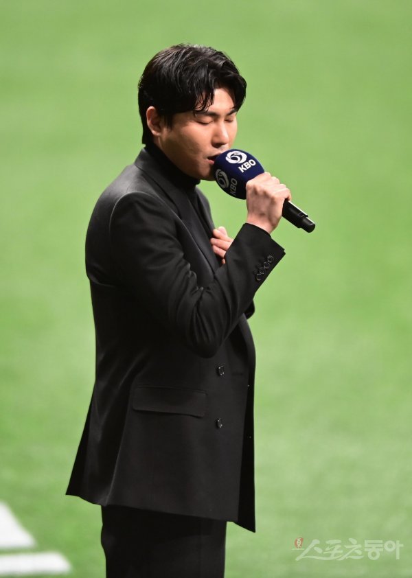 4일 서울 고척스카이돔에서 열린 ‘2022 신한은행 SOL KBO리그’ 한국시리즈 3차전 키움 히어로즈와 SSG 랜더스의 경기에 앞서 가수 카더가든이 애국가 제창을 하고 있다.