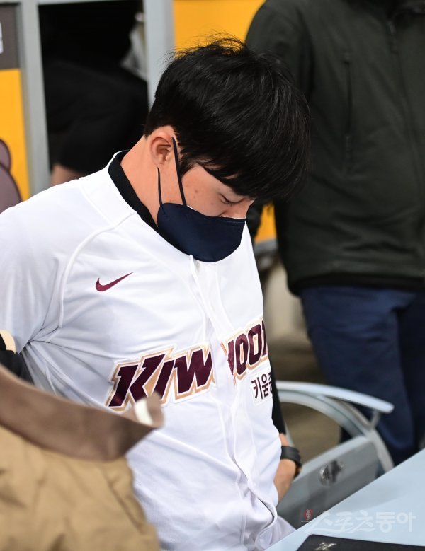 4일 서울 고척스카이돔에서 열린 ‘2022 신한은행 SOL KBO리그’ 한국시리즈 3차전 키움 히어로즈와 SSG 랜더스의 경기에 앞서 샌디에이고 김하성이 키움 유니폼을 입고 있다.