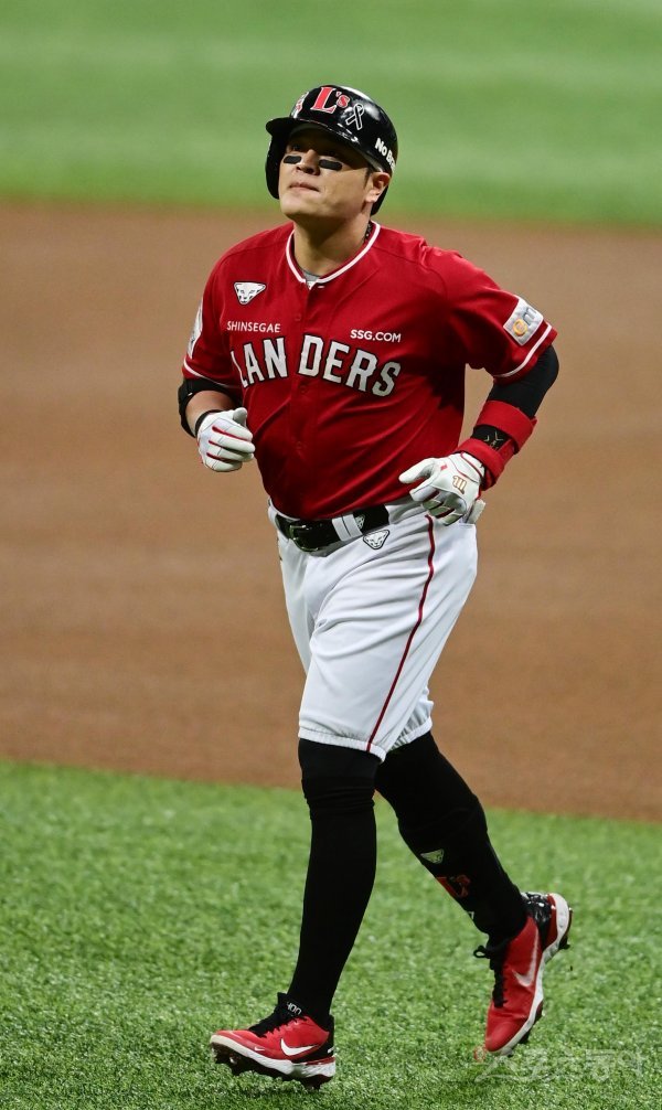 4일 서울 고척스카이돔에서 열린 ‘2022 신한은행 SOL KBO리그’ 한국시리즈 3차전 키움 히어로즈와 SSG 랜더스의 경기에서 1회초 무사 SSG 추신수가 뜬공으로 아웃되며 아쉬워하고 있다.