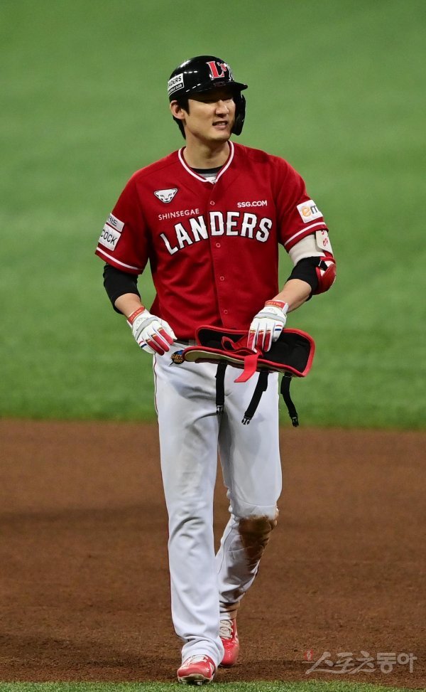 4일 서울 고척스카이돔에서 열린 ‘2022 신한은행 SOL KBO리그’ 한국시리즈 3차전 키움 히어로즈와 SSG 랜더스의 경기에서 4회초 2사 SSG 오태곤이 뜬공으로 아웃된 후 아쉬워하고 있다.