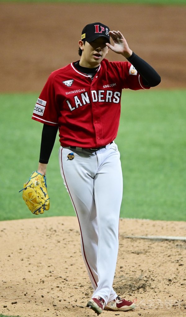 4일 서울 고척스카이돔에서 열린 ‘2022 신한은행 SOL KBO리그’ 한국시리즈 3차전 키움 히어로즈와 SSG 랜더스의 경기에서 3회말 2사 1, 2루 키움을 삼진으로 막은 SSG 오원석이 모자를 고쳐쓰고 있다.
