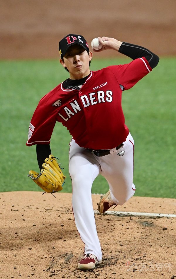 4일 서울 고척스카이돔에서 열린 ‘2022 신한은행 SOL KBO리그’ 한국시리즈 3차전 키움 히어로즈와 SSG 랜더스의 경기에서 선발 투수로 마운드에 오른 SSG 오원석이 역투하고 있다.