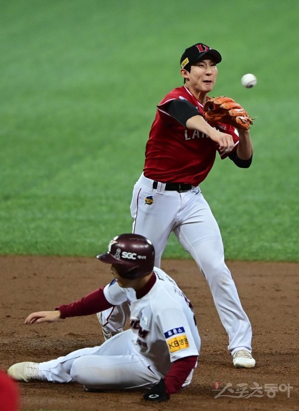 4일 서울 고척스카이돔에서 열린 ‘2022 신한은행 SOL KBO리그’ 한국시리즈 3차전 키움 히어로즈와 SSG 랜더스의 경기에서 3회말 1사 1루 키움의 내야 땅볼 때 SSG 박성한이 1루주자를 포스 아웃시킨 후 1루로 송구하고 있다.