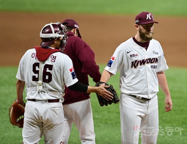 4일 서울 고척스카이돔에서 열린 ‘2022 신한은행 SOL KBO리그’ 한국시리즈 3차전 키움 히어로즈와 SSG 랜더스의 경기에서 6회초 2사 1, 3루 상황에서 키움 요키시가 마운드를 내려오고 있다.