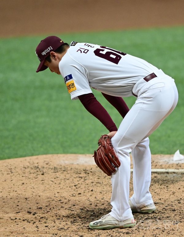 4일 서울 고척스카이돔에서 열린 ‘2022 신한은행 SOL KBO리그’ 한국시리즈 3차전 키움 히어로즈와 SSG 랜더스의 경기에서 8회초 2사 2루 SSG에 역전 투런 홈런을 허용한 키움 김동혁이 아쉬워하고 있다.