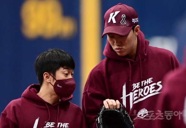 5일 서울 고척스카이돔에서 열린 ‘2022 신한은행 SOL KBO리그’ 한국시리즈 4차전 키움 히어로즈와 SSG 랜더스의 경기에 앞서 키움 안우진이 트레이너에게 물집을 보여주고 있다.