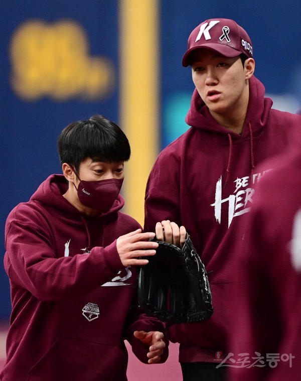 5일 서울 고척스카이돔에서 열린 ‘2022 신한은행 SOL KBO리그’ 한국시리즈 4차전 키움 히어로즈와 SSG 랜더스의 경기에 앞서 키움 안우진이 트레이너에게 물집을 보여주고 있다.