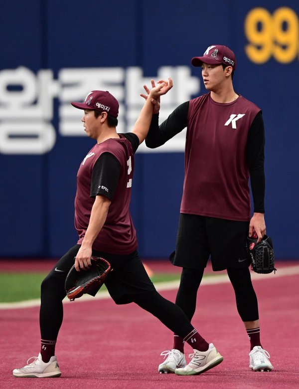5일 서울 고척스카이돔에서 열린 ‘2022 신한은행 SOL KBO리그’ 한국시리즈 4차전 키움 히어로즈와 SSG 랜더스의 경기에 앞서 키움 안우진이 김재현에게 송구 방법을 알려주고 있다.
