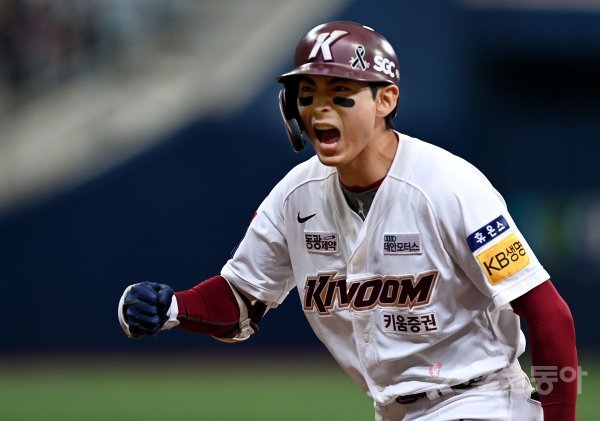5일 서울 고척스카이돔에서 ‘2022 신한은행 SOL KBO리그’ SSG 랜더스와 키움 히어로즈의 한국시리즈 4차전 경기가 열렸다. 3회말 무사 2루에서 키움 이정후가 1타점 역전 적시타를 날린 후 포효하고 있다.