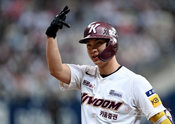 5일 서울 고척스카이돔에서 ‘2022 신한은행 SOL KBO리그’ SSG 랜더스와 키움 히어로즈의 한국시리즈 4차전 경기가 열렸다. 3회말 1사 3루에서 키움 신준우가 1타점 적시타를 날린 후 세리머니를 펼치고 있다.