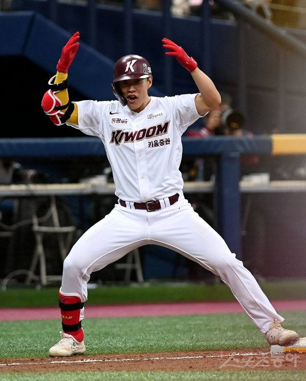 5일 서울 고척스카이돔에서 ‘2022 신한은행 SOL KBO리그’ SSG 랜더스와 키움 히어로즈의 한국시리즈 4차전 경기가 열렸다. 3회말 1사 1, 2루에서 키움 송성문이 2타점 싹쓸이 2루타 후 상대 실책으로 3루까지 진루해 포효하고 있다.