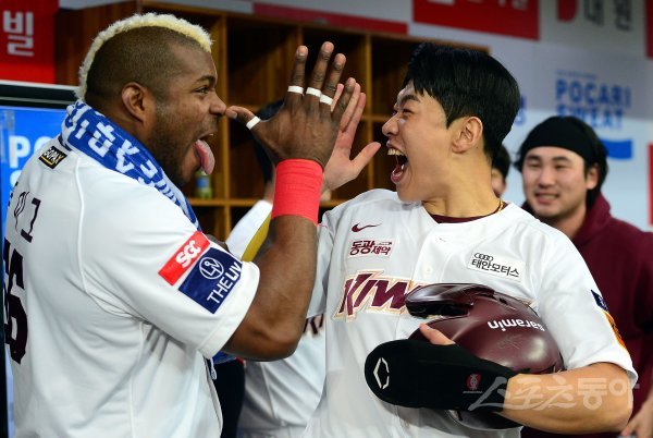 5일 서울 고척스카이돔에서 ‘2022 신한은행 SOL KBO리그’ SSG 랜더스와 키움 히어로즈의 한국시리즈 4차전 경기가 열렸다. 3회말 1사 3루에서 적시타 때 키움 송성문이 득점을 올린 후 푸이그와 기쁨을 나누고 있다.