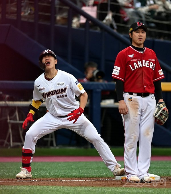 5일 서울 고척스카이돔에서 ‘2022 신한은행 SOL KBO리그’ SSG 랜더스와 키움 히어로즈의 한국시리즈 4차전 경기가 열렸다. 3회말 1사 1, 2루에서 키움 송성문이 2타점 싹쓸이 2루타 후 상대 실책으로 3루까지 진루해 포효하고 있다.