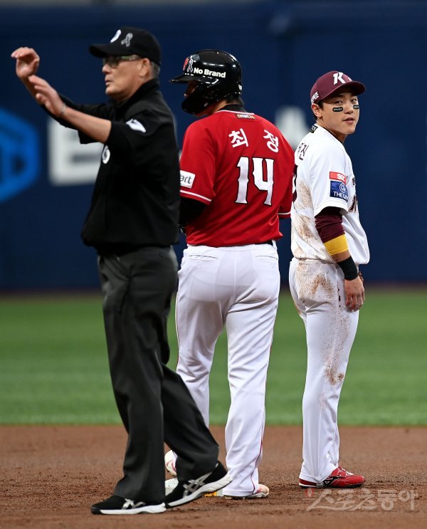 5일 서울 고척스카이돔에서 ‘2022 신한은행 SOL KBO리그’ SSG 랜더스와 키움 히어로즈의 한국시리즈 4차전 경기가 열렸다. 1회초 2사 1루에서 실책으로 SSG 최정의 2루 진루를 허용한 키움 김태진이 아쉬워하고 있다.