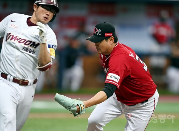 5일 서울 고척스카이돔에서 ‘2022 신한은행 SOL KBO리그’ SSG 랜더스와 키움 히어로즈의 한국시리즈 4차전 경기가 열렸다. 5회말 1사에서 내야땅볼 때 SSG 노경은이 수비를 펼치다 실책을 범하고 있다.