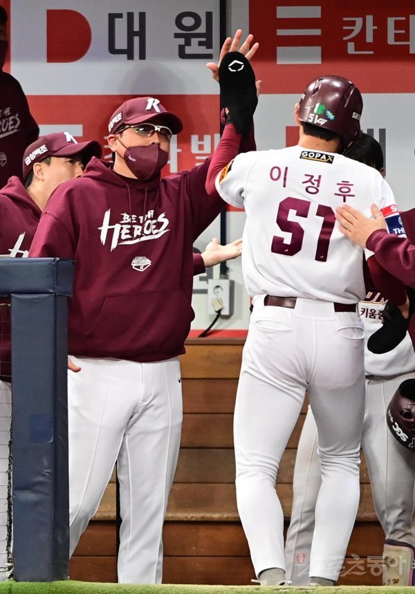 5일 서울 고척스카이돔에서 열린 ‘2022 신한은행 SOL KBO리그’ 한국시리즈 4차전 키움 히어로즈와 SSG 랜더스의 경기에서 3회말 1사 1, 2루 키움의 좌전 적시타 때 득점에 성공한 2루주자 이정후가 홍원기 감독의 축하를 받고 있다.