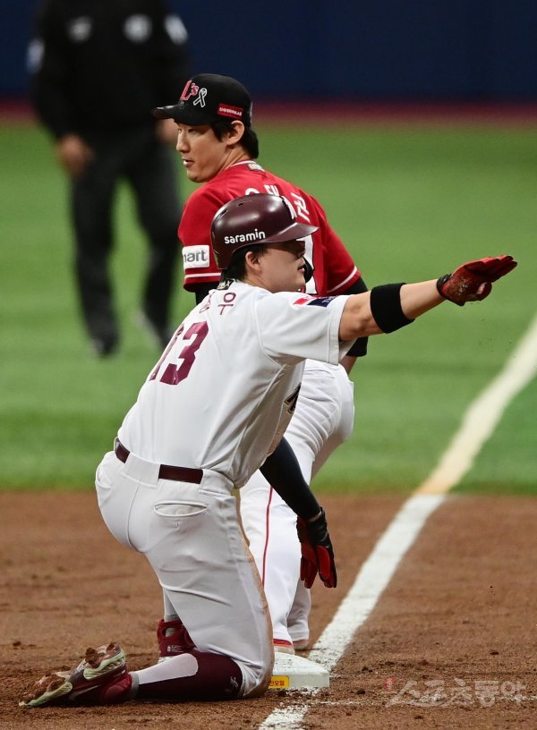 5일 서울 고척스카이돔에서 열린 ‘2022 신한은행 SOL KBO리그’ 한국시리즈 4차전 키움 히어로즈와 SSG 랜더스의 경기에서 1회말 1사 1루 키움의 내야 땅볼 때 1루주자 전병우가 1루로 귀루하는 과정에서 아웃이 선정되자 더그아웃을 향해 비디오판독을 요청하고 있다. 비디오판독 결과 세이프로 번복됐다.