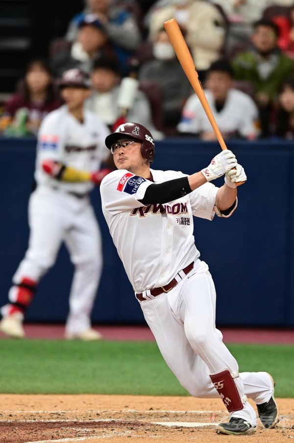 5일 서울 고척스카이돔에서 열린 ‘2022 신한은행 SOL KBO리그’ 한국시리즈 4차전 키움 히어로즈와 SSG 랜더스의 경기에서 3회말 1사 1, 2루 키움 이지영이 1타점 좌전 적시타를 치고 있다.