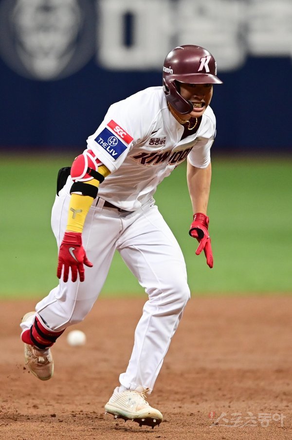 5일 서울 고척스카이돔에서 열린 ‘2022 신한은행 SOL KBO리그’ 한국시리즈 4차전 키움 히어로즈와 SSG 랜더스의 경기에서 3회말 1사 1, 2루 키움 송성문이 2타점 중전 2루타를 친 후 SSG 2루수의 포수 실책을 틈타 3루로 향하고 있다.