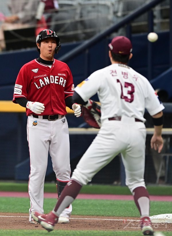 5일 서울 고척스카이돔에서 열린 ‘2022 신한은행 SOL KBO리그’ 한국시리즈 4차전 키움 히어로즈와 SSG 랜더스의 경기에서 1회초 1사 2루 SSG 최정이 선제 1타점 우전 적시타를 친 후 푸이그의 송구에 놀라고 있다.