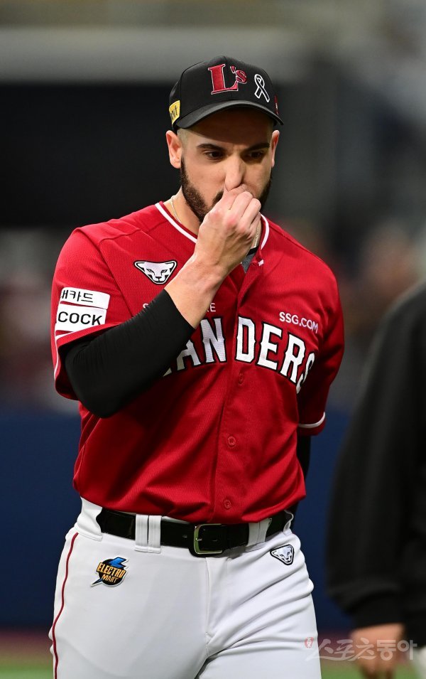 5일 서울 고척스카이돔에서 열린 ‘2022 신한은행 SOL KBO리그’ 한국시리즈 4차전 키움 히어로즈와 SSG 랜더스의 경기에서 3회말 1사 3루 상황에서 SSG 모리만도가 마운드를 내려오고 있다.