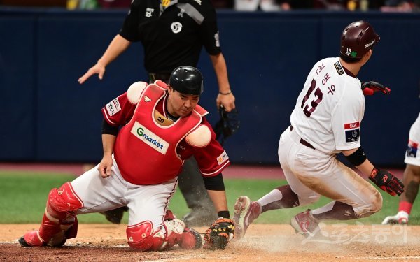 5일 서울 고척스카이돔에서 열린 ‘2022 신한은행 SOL KBO리그’ 한국시리즈 4차전 키움 히어로즈와 SSG 랜더스의 경기에서 3회말 무사 2루 키움의 우전 적시타 때 SSG 이재원이 키움 2루주자에게 득점을 허용하고 있다.