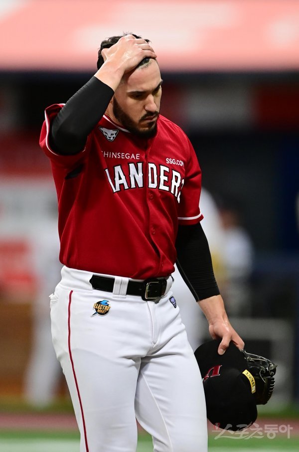 5일 서울 고척스카이돔에서 열린 ‘2022 신한은행 SOL KBO리그’ 한국시리즈 4차전 키움 히어로즈와 SSG 랜더스의 경기에서 2회초 수비를 마친 SSG 모리만도가 아쉬워하고 있다.