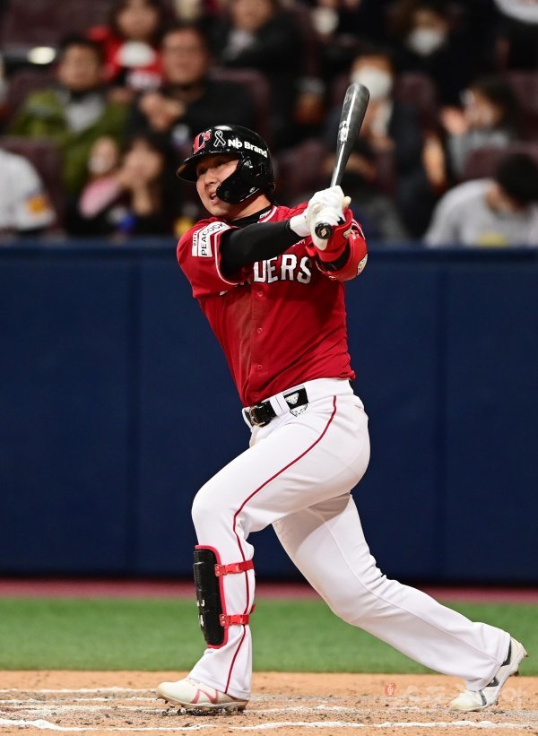 5일 서울 고척스카이돔에서 열린 ‘2022 신한은행 SOL KBO리그’ 한국시리즈 4차전 키움 히어로즈와 SSG 랜더스의 경기에서 7회초 2사 만루 SSG 최정이 2타점 좌전 적시타를 치고 있다.