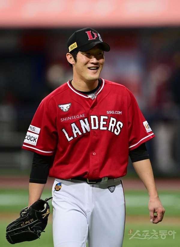 5일 서울 고척스카이돔에서 열린 ‘2022 신한은행 SOL KBO리그’ 한국시리즈 4차전 키움 히어로즈와 SSG 랜더스의 경기에서 7회말 2사 만루 위기를 막은 SSG 박종훈이 더그아웃으로 향하며 웃고 있다.