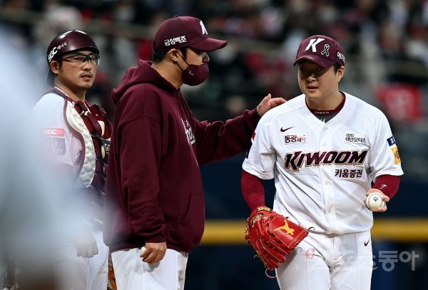 5일 서울 고척스카이돔에서 ‘2022 신한은행 SOL KBO리그’ SSG 랜더스와 키움 히어로즈의 한국시리즈 4차전 경기가 열렸다. 8회초 2사 만루에서 키움 김재웅이 교체되고 있다.