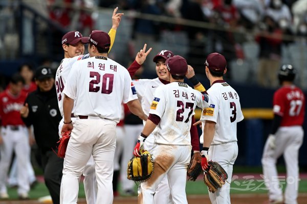 5일 서울 고척스카이돔에서 ‘2022 신한은행 SOL KBO리그’ SSG 랜더스와 키움 히어로즈의 한국시리즈 4차전 경기가 열렸다. 키움이 SSG를 상대로 6-3으로 승리한 후 선수들이 그라운드에서 기쁨을 나누고 있다.