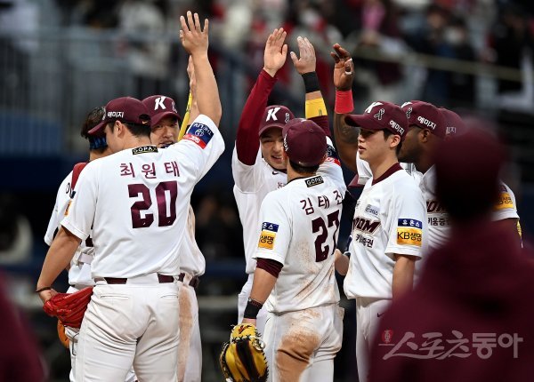 5일 서울 고척스카이돔에서 ‘2022 신한은행 SOL KBO리그’ SSG 랜더스와 키움 히어로즈의 한국시리즈 4차전 경기가 열렸다. 키움이 SSG를 상대로 6-3으로 승리한 후 선수들이 그라운드에서 기쁨을 나누고 있다.