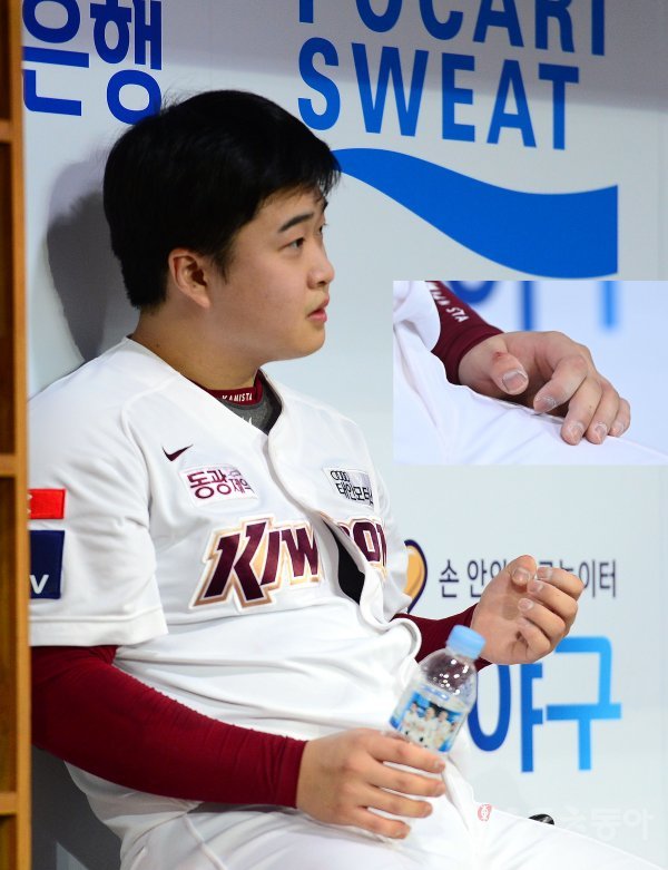 5일 서울 고척스카이돔에서 ‘2022 신한은행 SOL KBO리그’ SSG 랜더스와 키움 히어로즈의 한국시리즈 4차전 경기가 열렸다. 키움 김재웅이 교체후 더그아웃에서 피나는 손을 살펴보고 있다.