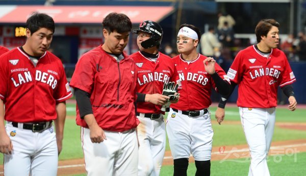 5일 서울 고척스카이돔에서 열린 ‘2022 신한은행 SOL KBO리그’ 한국시리즈 4차전 키움 히어로즈와 SSG 랜더스의 경기에서 3-6으로 패한 SSG 선수들이 더그아웃으로 향하고 있다.