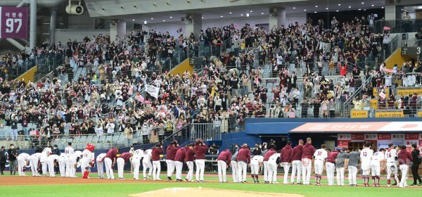 5일 서울 고척스카이돔에서 열린 ‘2022 신한은행 SOL KBO리그’ 한국시리즈 4차전 키움 히어로즈와 SSG 랜더스의 경기에서 6-3으로 승리한 키움 선수들이 팬들에게 인사하고 있다.