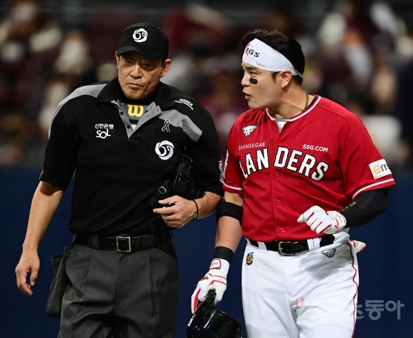 5일 서울 고척스카이돔에서 열린 ‘2022 신한은행 SOL KBO리그’ 한국시리즈 4차전 키움 히어로즈와 SSG 랜더스의 경기에서 8회초 2사 만루 SSG 추신수가 뜬공으로 아웃된 후 심판과 이야기하고 있다.