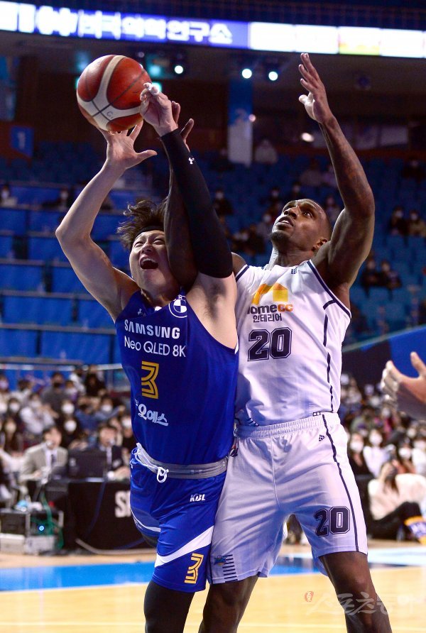 6일 잠실체육관에서 열린 ‘2022-2023 프로농구’ 서울 삼성과 전주 KCC 경기에서 KCC 라건아와 삼성 이정현이 리바운드 볼을 다투고 있다.