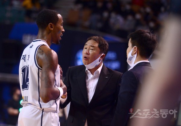 6일 잠실체육관에서 열린 ‘2022-2023 프로농구’ 서울 삼성과 전주 KCC 경기에서 KCC 전창진 감독이 제퍼슨에게 작전 지시를 하고 있다.