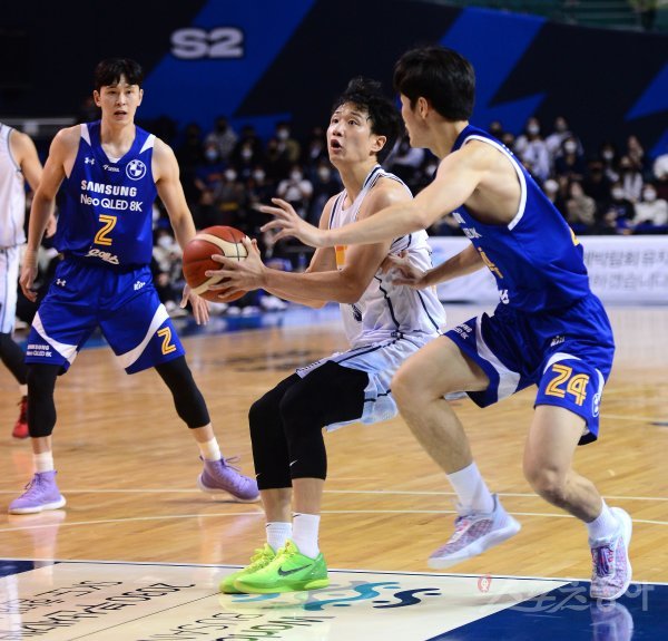 6일 잠실체육관에서 열린 ‘2022-2023 프로농구’ 서울 삼성과 전주 KCC 경기에서 KCC 허웅이 삼성의 수비를 뚫고 골밑을 공격하고 있다.