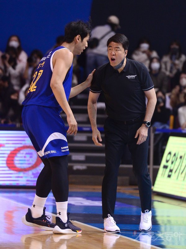 6일 잠실체육관에서 열린 ‘2022-2023 프로농구’ 서울 삼성과 전주 KCC 경기에서 삼성 은희석 감독이 작전 지시를 하고 있다.