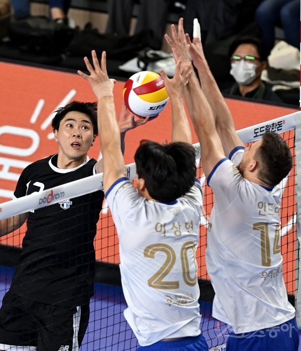 6일 충청남도 천안 유관순체육관에서 ‘2022-2023 도드람 V리그’ 천안 현대캐피탈과 서울 우리카드의 남자부 경기가 열렸다. 현대캐피탈 전광인이 우리카드 블로커를 피해 공격을 펼치고 있다.