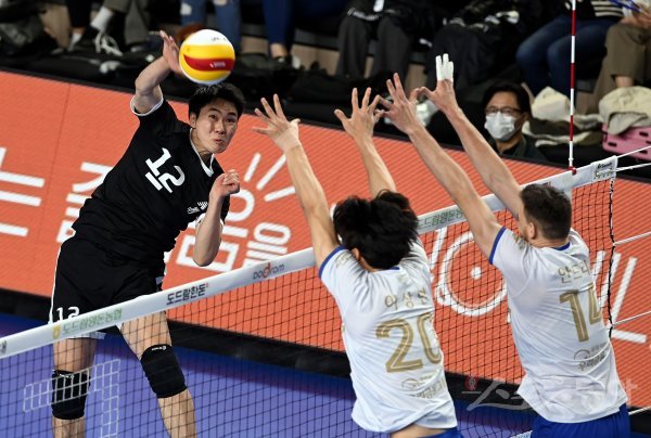 6일 충청남도 천안 유관순체육관에서 ‘2022-2023 도드람 V리그’ 천안 현대캐피탈과 서울 우리카드의 남자부 경기가 열렸다. 현대캐피탈 전광인이 우리카드 블로커를 피해 스파이크를 날리고 있다.