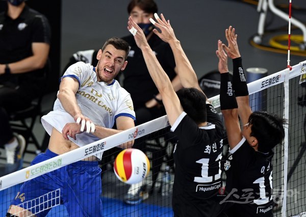 6일 충청남도 천안 유관순체육관에서 ‘2022-2023 도드람 V리그’ 천안 현대캐피탈과 서울 우리카드의 남자부 경기가 열렸다. 우리카드 안드리치가 현대캐피탈 블로커를 피해 스파이크를 날리고 있다.